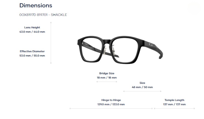 Gọng Kính Oakley Shackle OX8197D có 2 kích cỡ (Size M và Size L), phù hợp với đa số khuôn mặt người lớn.