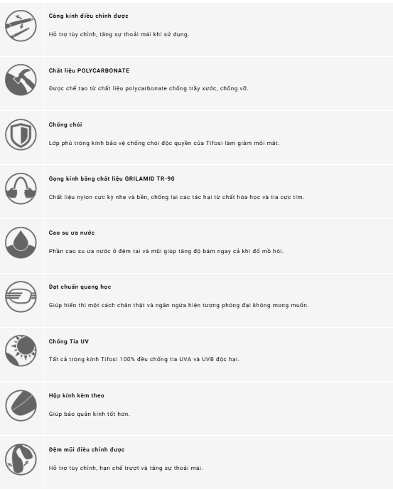 Tifosi Moab Lite được phát triển dành cho những người chơi thể thao ngoài trời yêu cầu sự ổn định cao, trọng lượng nhẹ và khả năng quan sát không bị giới hạn. Mẫu kính này hướng đến cảm giác đeo “thoáng – chắc – linh hoạt”, giúp người dùng tập trung hoàn toàn vào chuyển động thay vì phải điều chỉnh kính liên tục.