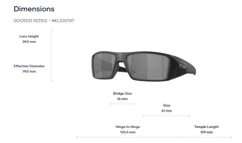 Heliostat có thiết kế High Bridge Fit (Cầu kính cao) và kiểu dáng ôm gọn, phù hợp với nam giới có khuôn mặt vừa và nhỏ. Dưới đây là bảng thông số kỹ thuật của Oakley OO9231 Heliostat
