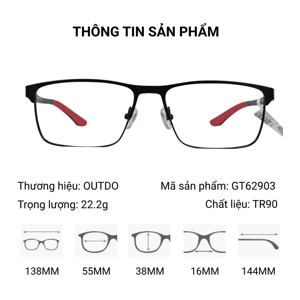 Outdo GT62903 là mẫu gọng kính thể thao nam mang phong cách năng động và hiện đại, phù hợp cho người thường xuyên vận động hoặc cần một chiếc kính nhẹ và bền để sử dụng hằng ngày. Thiết kế tối ưu giúp sản phẩm vừa đảm bảo tính thẩm mỹ vừa đáp ứng tốt nhu cầu thực tế.